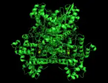 Pyruvate dehydrogenase complex (PDC) is a complex of three enzymes that converts pyruvate into acetyl-CoA by a process called pyruvate decarboxylation.[1] Acetyl-CoA may then be used in the citric acid cycle to carry out cellular respiration, and this complex links the glycolysis metabolic pathway to the citric acid cycle. Pyruvate decarboxylation is also known as the "pyruvate dehydrogenase reaction" because it also involves the oxidation of pyruvate.[2]