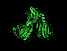 Eukaryotes also contain 12 copies of an additional core protein, E3 binding protein (E3BP) which bind the E3 subunits to the E2 core.[10] The exact location of E3BP is not completely clear. Cryo-electron microscopy has established that E3BP binds to each of the icosahedral faces in yeast.[11] However, it has been suggested that it replaces an equivalent number of E2 molecules in the bovine PDC core.