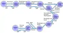 In cases where PDCD is a result of a mutation in a gene other than PDHA1, it is most commonly known to be due to mutations in the following six genes, PDHB, DLAT, PDHX, PDP1, DLD, and LIAS.[13][14] All of these genes, like the PDHA1 gene are responsible for coding for a specific subunit of the pyruvate dehydrogenase complex. The PDHB gene is responsible for the coding of the E1 beta subunit of the pyruvate dehydrogenase complex. The DLAT gene is responsible for the coding of the E2 subunit, and the PDP1 is responsible for producing the PDH phosphatase catalytic subunit that catalyzes PDH dephosphorylation. This dephosphorylation activates the complex. The final gene that could be responsible for this disease is the PDHX gene, which codes for the E3 binding protein which is responsible for binding E3 dimers to the E2 subunit of the complex.[15] The DLD gene is responsible for encoding dihydrolipoamide dehydrogenase, a flavoprotein component known as E3, required by the pyruvate dehydrogenase complex.[14] The LIAS gene is responsible for synthesizing lipoic acid, a cofactor required by the pyruvate dehydrogenase complex.[14]