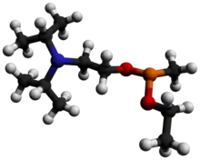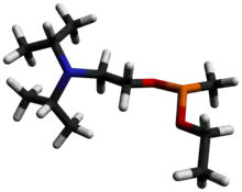 QL is a component in binary chemical weapons, mainly VX nerve agent.[3] It, along with methylphosphonyl difluoride (DF), was developed during the 1980s in order to replace an aging stockpile of unitary chemical weapons.[3] QL is listed as a Schedule 1 chemical by the Chemical Weapons Convention.[4]