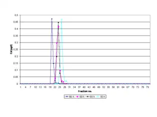 Before an electrophoretic run is started the prepared 4% T (total polymer content (T)), 2.67% C (cross-linker concentration (C)) gel is pre-run to equilibrate it.[9] It is essentially non-sieving and optimal for electrophoresis of proteins greater than or equal to 200 ku. Proteins migrate in it more or less on the basis of their free mobility.[25] For these reasons interactions of the gel with the biomolecules are negligibly low, and thus, the proteins separate cleanly and predictably at a polymerization time of 69 hr (cf. fig. Electropherogram). The separated metalloproteins including biomolecules ranging from approximately < 1 ku to greater than 30 ku (e.g., metal chaperones, prions, metal transport proteins, amyloids, metalloenzymes, metallopeptides, metallothionein, phytochelatins) are not dissociated into apoproteins and metal cofactors.[26]