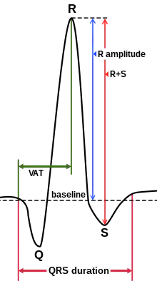 Looking at the precordial leads, the R wave usually progresses from showing an rS-type complex in V1 with an increasing R and a decreasing S wave when moving toward the left side. There is usually a qR-type of complex in V5 and V6, with the R-wave amplitude usually taller in V5 than in V6. It is normal to have a narrow QS and rSr' patterns in V1, and this is also the case for qRs and R patterns in V5 and V6. The transition zone is where the QRS complex changes from predominantly negative to predominantly positive (R/S ratio becoming >1), and this usually occurs at V3 or V4. It is normal to have the transition zone at V2 (called "early transition") and at V5 (called "delayed transition").[11] In biomedical engineering, the maximum amplitude in the R wave is usually called "R peak amplitude", or just "R peak".[12][13] Accurate R peak detection is essential in signal processing equipment for heart rate measurement and it is the main feature used for arrhythmia detection.[14][15]