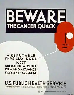 Quackery, often synonymous with health fraud, is the promotion[1] of fraudulent or ignorant medical practices. A quack is a "fraudulent or ignorant pretender to medical skill" or "a person who pretends, professionally or publicly, to have skill, knowledge, qualification or credentials they do not possess; a charlatan or snake oil salesman".[2] The term quack is a clipped form of the archaic term quacksalver, from Dutch: kwakzalver a "hawker of salve".[3] In the Middle Ages the term quack meant "shouting". The quacksalvers sold their wares at markets by shouting to gain attention.[4]