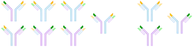 Possible combinations of light and heavy chains in antibodies produced by quadroma cell lines. The seven antibodies on the left have at least one mismatched binding region. Of the three antibodies on the right, two are not hybridised, and the remaining (rightmost) is the desired trifunctional antibody. Mixed-species quadromas produce (nearly) none of the seven mismatched antibodies.