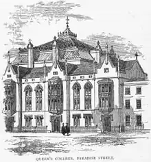 Queen's College was a medical school in central Birmingham, England, and a predecessor college of the University of Birmingham. It was founded by surgeon William Sands Cox in 1825 as The Birmingham Medical School, a residential college for medical students. Cox's ambition was for the college to teach arts, law, engineering, architecture and general science. It was the first Birmingham institution to award degrees, through the University of London.[1]