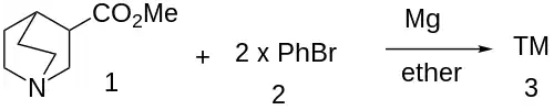 The Grignard reaction between methylquinuclidine-3-carboxylate [38206-86-9] (1) and phenylmagnesium bromide (2) gave the benzhydryl alcohol product ~29% yield. The ethyl ester is cas: [6238-33-1]