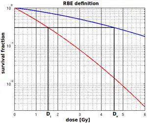 where DX is a reference absorbed dose of radiation of a standard type X, and DR is the absorbed dose of radiation of type R that causes the same amount of biological damage. Both doses are quantified by the amount of energy absorbed in the cells.