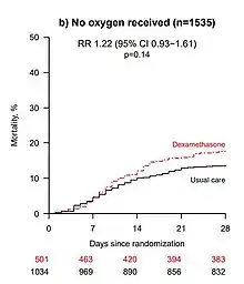 Based on the preliminary, unpublished results of the RECOVERY trial, the US National Institutes of Health COVID-19 Treatment Guidelines Panel recommended dexamethasone in patients with COVID-19 who are on mechanical ventilation or those who require supplemental oxygen, and recommended against dexamethasone for those not requiring supplemental oxygen.[23]