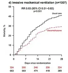 On 22 June 2020, preliminary results were published in a preprint showing that low-dose dexamethasone treatment reduced the death rate by one third in hospitalized people needing ventilators due to severe COVID-19 infection, and by one fifth in people treated with oxygen therapy. There was no benefit (and the possibility of harm) among people who did not require oxygen.[18] The preliminary report was subsequently published in The New England Journal of Medicine.[19]