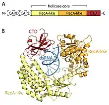 The RLR receptors are members of the DEAD-box (SF2) helicase family (despite containing a DExD/H motif, rather than the DEAD motif characteristic of the family) and share a common domain architecture. All contain a catalytic helicase core made up of two RecA-like domains. The catalytic helicase core contains at least 9 highly conserved sequence motifs that coordinate ATP and RNA binding and the hydrolysis of ATP to unwind RNA. A C-terminal domain (CTD; InterPro: IPR021673) follows the helicase core and this domain also binds viral RNA. Distinct RNA-binding loops within the CTD of the three RLRs dictate the type of RNA that they can bind.[16] In addition to the helicase core and CTD, RIG-I and MDA5 have two N-terminal CARD (caspase active recruitment domains) that are essential to the initiation of downstream signaling. LGP2 is dissimilar to both RIG-I and MDA5 as it lacks the CARD signaling domains and instead is implicated as a positive and negative regulator of RIG-I and MDA5.[14][17][18][19][20][15][21]