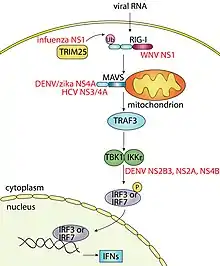 Viruses have evolved ways to subvert RLR signaling to enhance their survival. For example, influenza A virus and West Nile virus (WNV) use their NS1 (nonstructural protein 1) proteins to block RIG-I ubiquitination by TRIM25, or cause RIG-I degradation, respectively, which in turn inhibits IFN production.[29][31] This outcome is also achieved by the hepatitis C (HCV) NS3/4A protein by cleaving a part of MAVS,[32] and the foot-and-mouth disease virus (FMDV) leader protease (Lpro) which cleaves LGP2.[33] Likewise, dengue virus (DENV) uses its NS2B3, NS2A and NS4B proteins to bind IKKε and prevent IRF3 phosphorylation[34][35] and its NS4A protein, as per the zika virus, to bind MAVS to block RLR receptor binding.[36][37] Another prominent example is that of the paramyxovirus V proteins, which directly bind various RLR or downstream signaling proteins including MDA5, LGP2, and STAT,[38][39][40] or proteins such as PP1α and PP1γ[30] that negatively regulate RLR signaling.