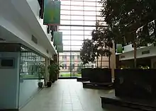 The breezeway between Frank E. Gannett Hall (right) and the George Eastman building (left)