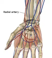 Radial artery puncture is a medical procedure performed to obtain a sample of arterial blood for gas analysis.[1] A needle is inserted into the radial artery and spontaneously fills with blood. The syringe is either prepacked with a small amount of heparin to prevent coagulation, or must be heparinised, by drawing up a small amount of heparin and squirting it out again.. The available evidence suggests that the use of local anaesthesia, prior to arterial puncture, does not reduce the perceived pain of the procedure.[2]