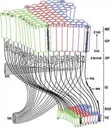 Intimately related to the RUH is the 'protomap' hypothesis, which states that the primordial identity of each functional area of the cerebral cortex is encoded within the cortical stem cells prior to the formation of the cortical layers.[1] Within each developing radial unit, the process of neurogenesis gives rise to post-mitotic (non-dividing) cortical neurons, which begin the process of radial neuronal migration from the ventricular zone and adjacent subventricular zone to form the cortical plate in the classic 'inside-out' manner beginning with the deep cortical layers.[4][5] Once their final destination is achieved, cortical neurons begin to form circuits with other cortical and subcortical neurons, often taking on a columnar shape following the radial migration route.[6] Some localized lateral dispersion takes place during cortical column development in the mouse, but the degree of dispersion is molecularly regulated and indeed could vary across species.[7]