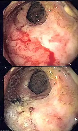 Radiation proctitis or radiation proctopathy is a condition characterized by damage to the rectum after exposure to x-rays or other ionizing radiation as a part of radiation therapy.[1] Radiation proctopathy may occur as acute inflammation called "acute radiation proctitis" (and the related radiation colitis) or with chronic changes characterized by radiation associated vascular ectasiae (RAVE) and chronic radiation proctopathy.[2][1] Radiation proctitis most commonly occurs after pelvic radiation treatment for cancers such as cervical cancer, prostate cancer, bladder cancer, and rectal cancer. RAVE and chronic radiation proctopathy involves the lower intestine, primarily the sigmoid colon and the rectum, and was previously called chronic radiation proctitis, pelvic radiation disease and radiation enteropathy.[3]