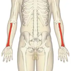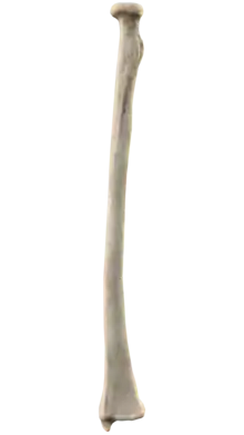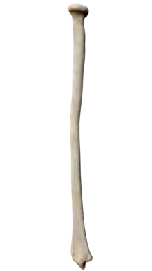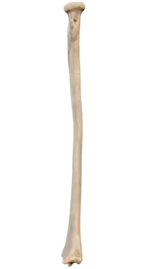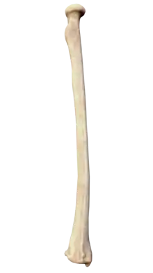 The radius or radial bone is one of the two large bones of the forearm, the other being the ulna. It extends from the lateral side of the elbow to the thumb side of the wrist and runs parallel to the ulna. The ulna is usually slightly longer than the radius, but the radius is thicker. Therefore the radius is considered to be the larger of the two. It is a long bone, prism-shaped and slightly curved longitudinally.