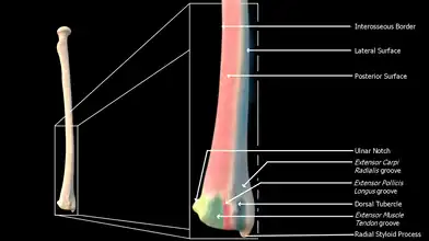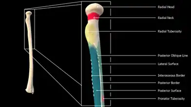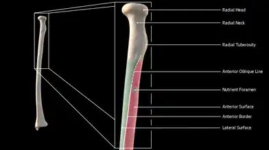 The radius has a body and two extremities. The upper extremity of the radius consists of a somewhat cylindrical head articulating with the ulna and the humerus, a neck, and a radial tuberosity. The body of the radius is self-explanatory, and the lower extremity of the radius is roughly quadrilateral in shape, with articular surfaces for the ulna, scaphoid and lunate bones. The distal end of the radius forms two palpable points, radially the styloid process and Lister's tubercle on the ulnar side. Along with the proximal and distal radioulnar articulations, an interosseous membrane originates medially along the length of the body of the radius to attach the radius to the ulna.[1]