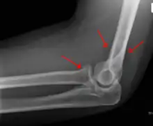 • Proximal radius fracture. A fracture within the capsule of the elbow joint results in the fat pad sign or "sail sign" which is a displacement of the fat pad at the elbow.