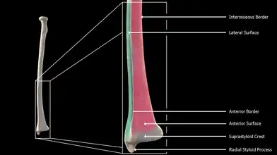 The lateral surface (facies lateralis; external surface) is convex throughout its entire extent and is known as the convexity of the radius, curving outwards to be convex at the side. Its upper third gives insertion to the supinator muscle. About its center is a rough ridge, for the insertion of the pronator teres muscle.[2] Its lower part is narrow, and covered by the tendons of the abductor pollicis longus muscle and extensor pollicis brevis muscle.