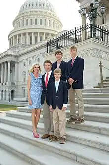 When Rand was 13, his father Ron Paul was elected to the United States House of Representatives.[17] That same year, Paul attended the 1976 Republican National Convention, where his father headed Ronald Reagan's Texas delegation.[18] The younger Paul spent several summer vacations interning in his father's congressional office.[19] In his teenage years, Paul studied the Austrian economists that his father respected, as well as the writings of Objectivist philosopher Ayn Rand.[10] Paul went to Brazoswood High School and was on the swimming team and played defensive back on the football team.[8][14]