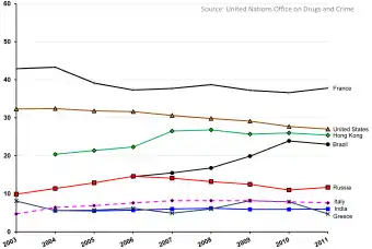 In 2007, the U.S. Department of State reported 31,833 rapes in China, but no similar report by the Chinese government has been made available.[1] Same-sex sexual assault between male adults was made illegal in late 2015.[2] Domestic and foreign victims of sex trafficking in China are raped.[3]