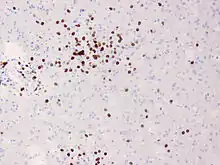 The cause of the inflammation is not known: infection by a virus has been suggested, but the evidence for this is inconclusive.[1] In the 1990s it was suggested that auto-antibodies against the glutamate receptor GluR3 were important in causing the disease,[3] but this is no longer thought to be the case.[4] However, more recent studies report the presence of autoantibodies against the NMDA-type glutamate receptor subunit GluRepsilon2 (anti-NR2A antibodies) in a subset of patients with Rasmussen's encephalitis.[5] There has also been some evidence that patients with RE express auto-antibodies against alpha 7 subunit of the nicotinic acetylcholine receptor.[6] By sequencing T cell receptors from various compartments it could be shown that RE patients present with peripheral CD8+ T-cell expansion which in some cases have been proven for years after disease onset.[7]