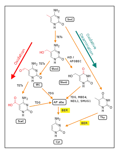 Demethylation of 5-Methylcytosine (5mC) in neuron DNA. As reviewed in 2018,[82] in brain neurons, 5mC is oxidized by the ten-eleven translocation (TET) family of dioxygenases (TET1, TET2, TET3) to generate 5-hydroxymethylcytosine (5hmC). In successive steps TET enzymes further hydroxylate 5hmC to generate 5-formylcytosine (5fC) and 5-carboxylcytosine (5caC). Thymine-DNA glycosylase (TDG) recognizes the intermediate bases 5fC and 5caC and excises the glycosidic bond resulting in an apyrimidinic site (AP site). In an alternative oxidative deamination pathway, 5hmC can be oxidatively deaminated by activity-induced cytidine deaminase/apolipoprotein B mRNA editing complex (AID/APOBEC) deaminases to form 5-hydroxymethyluracil (5hmU) or 5mC can be converted to thymine (Thy). 5hmU can be cleaved by TDG, single-strand-selective monofunctional uracil-DNA glycosylase 1 (SMUG1), Nei-Like DNA Glycosylase 1 (NEIL1), or methyl-CpG binding protein 4 (MBD4). AP sites and T:G mismatches are then repaired by base excision repair (BER) enzymes to yield cytosine (Cyt).