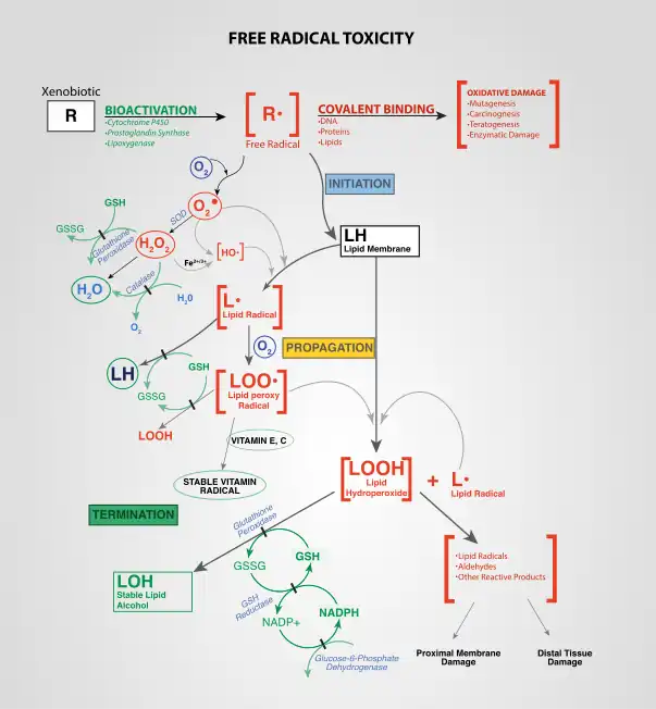 Free radical mechanisms in tissue injury. Free radical toxicity induced by xenobiotics and the subsequent detoxification by cellular enzymes (termination).