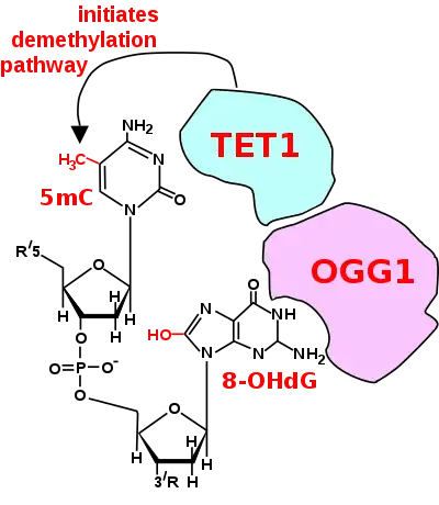 In mammalian nuclear DNA, a methyl group can be added, by a DNA methyltransferase, to the 5th carbon of cytosine to form 5mC (see red methyl group added to form 5mC near the top of the first figure). The DNA methyltransferases most often form 5mC within the dinucleotide sequence "cytosine-phosphate-guanine" to form 5mCpG. This addition is a major type of epigenetic alteration and it can silence gene expression. Methylated cytosine can also be demethylated, an epigenetic alteration that can increase the expression of a gene. A major enzyme involved in demethylating 5mCpG is TET1. However, TET1 is only able to act on 5mCpG if an ROS has first acted on the guanine to form 8-hydroxy-2'-deoxyguanosine (8-OHdG), resulting in a 5mCp-8-OHdG dinucleotide (see first figure).[81] However, TET1 is only able to act on the 5mC part of the dinucleotide when the base excision repair enzyme OGG1 binds to the 8-OHdG lesion without immediate excision. Adherence of OGG1 to the 5mCp-8-OHdG site recruits TET1 and TET1 then oxidizes the 5mC adjacent to 8-OHdG, as shown in the first figure, initiating a demethylation pathway shown in the second figure.