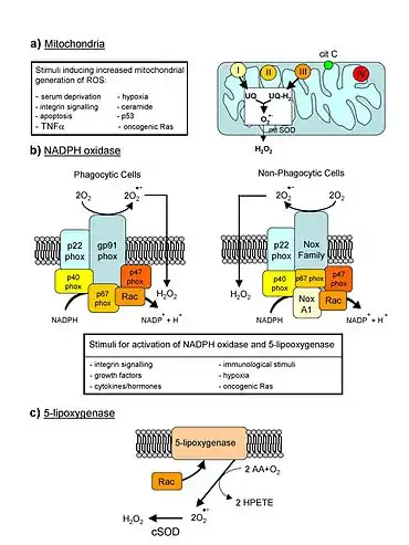 Major cellular sources of ROS in living non-photosynthetic cells. From a review by Novo and Parola, 2008.[13][14]
