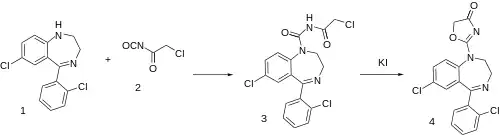 The reduction of the lactam in Delorazepam with lithium aluminium hydride gives CID:20333776 (1). Condensation with 2-chloroacetylisocyanate [4461-30-7] (2) proceeds to afford urea, CID:20333773 (3). Reaction of that with sodium iodide and base probably proceeds initially by halogen exchange of iodine for chlorine (Finkelstein reaction). Subsequent replacement of iodide by the enol anion of the urea oxygen results in formation of the oxazolone ring. There is thus obtained reclazepam (4).