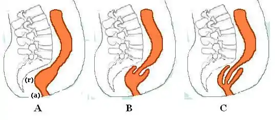 - poor posterior rectal fixation, resulting in loss of posterior fixation of the rectum to the sacral curve[5]