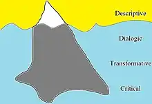 Reflection is not linear, uniform, and homogeneous.[31] Nguyen Nhat Quang (2022) adopts Fleck (2012)'s classification of reflective practices into an iceberg of reflection.[32] That is, reflection consists of different layers representing four stages. Descriptive reflection is the tip of the iceberg as it manifests as narratives of reality without any multilateral accounts and analyses to bring forward a change in individual perspective. Dialogic reflection, just below water surface, represents the interdependence and correlations of experiences through iterative self- questioning cycles seeking reasons for an action. After identifying these reasons, this process can provide the reflectors with alternative interpretations. Following repeated cycles of dialogic reflection, transformative reflection allows the reflective practitioners to revisit issues with alternative solutions that may create more transformative and welcomed outcomes compared to those in the past. Critical reflection, the deepest level of reflection, goes beyond the reflection-on-action process by looking at what, why, and how an incident or series of incidents happened through an ecological well-rounded lens inclusive of social, historical, political, and cultural factors. It is important to note that not all reflective practices are able to reach all four layers as the depth of reflection is subjective to reflectors' cognitive, metacognitive ability as well as their sociocultural background.