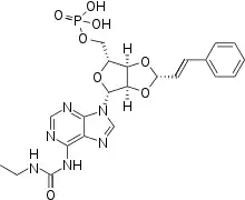 Regrelor was synthesized from adenosine diphosphate (ADP), an endogenous chemical involved in metabolism.[7] The authors noted that the addition of a lipophilic moiety like cinnamaldehyde at the C-2' and C-3' positions, combined with ethylurea at N-6 on the adenine base, yielded regrelor.[8]