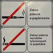 - Poland: Since a revision of the tobacco prohibition law in 2016.[138] There has been a large change in the e-cigarette regulation, previously where it was very loose. Currently there is ban on sales to under 18s, prohibition of marketing, sales online, in cigarette machines and a ban in hospitals & all public transport including PKP train stations but not in airports. Vapers who break the laws are liable to a fine of up to 500 zloty (approximately €109.70).[139]