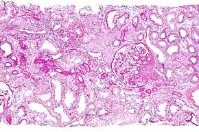Micrograph showing a renal core biopsy. PAS stain.