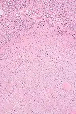 | Micrograph of a renal medullary fibroma (bottom of image). Renal tubules are seen at the top of the image. H&E stain. | |