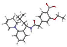 Repaglinide is an antidiabetic drug in the class of medications known as meglitinides, and was invented in 1983. Repaglinide is a medication used in addition to diet and exercise for blood sugar control in type 2 diabetes.[1] The mechanism of action of repaglinide involves promoting insulin release from β-islet cells of the pancreas; like other antidiabetic drugs, a main side effect concern is hypoglycemia.[1] It is sold by Novo Nordisk under the name of Prandin in the United States, Gluconorm in Canada, Surepost in Japan, Repaglinide in Egypt, and Novonorm elsewhere. In Japan it is produced by Dainippon Sumitomo Pharma.[2]