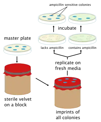 Replica plating is a microbiological technique in which one or more secondary Petri plates containing different solid (agar-based) selective growth media (lacking nutrients or containing chemical growth inhibitors such as antibiotics) are inoculated with the same colonies of microorganisms from a primary plate (or master dish), reproducing the original spatial pattern of colonies. The technique involves pressing a velveteen-covered disk, and then imprinting secondary plates with cells in colonies removed from the original plate by the material. Generally, large numbers of colonies (roughly 30-300) are replica plated due to the difficulty in streaking each out individually onto a separate plate.