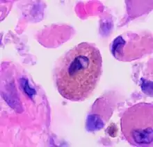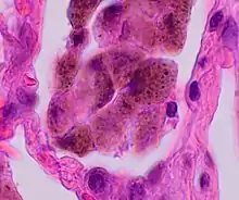 | A "smoker's macrophage", with yellow to light brown and finely granular cytoplasmic pigment. | |