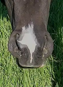 The horse's olfactory receptors are located in the mucosa of the upper nasal cavity. Due to the length of the nasal cavity, there is a large area of these receptors, and the horse has a better ability to smell than a human. Additionally, the horse also has a vomeronasal organ, or Jacobson's Organ, which is in the hard palate, and is able to pick up pheromones and other scents when a horse exhibits the flehmen response. The flehmen response forces air through slits in the nasal cavity and into the vomeronasal organ. Unlike many other animals, the horse's Jacobson's Organ doesn't open into the oral cavity.[6]