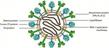 Respirovirions are enveloped, with spherical geometries. The diameter is around 150 nm. Respirovirus genomes are linear, around 15kb in length. The genome codes for 8 proteins.[3][4]