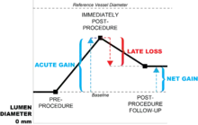 But late loss is only part of the terminology in describing the outcomes of vascular interventions. For instance, the implantation of a stent-graft will first provide an acute gain in lumen diameter. In other words, there is an immediate gain in lumen size because the implanted stent opens up the vessel. However, over time, the body's inflammatory immune response (described below in the "Causes" section) reacts to the stent-graft via smooth muscle proliferation, etc., which literally pushes the stent-graft back, narrowing the vessel and losing at least a percentage of what was previously gained, or late loss.