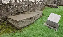 Violent mobs were not the only problems body snatchers faced. Naples also wrote of how he met "patrols" and how "dogs flew at us",[41] references to some of the measures taken to secure graves against his ilk. The aristocracy and very rich placed their dead in triple coffins, vaults and private chapels, sometimes guarded by servants. For the less wealthy, double coffins were available, buried on private land in deep graves. More basic defences included the placing of heavy weights over the coffin, or simply filling the grave with stones rather than soil. Such deterrents were sometimes deployed in vain; at least one London graveyard was owned by an anatomist who, it was reported, "obtained a famous supply [of cadavers] ... and he could charge pretty handsomely for burying a body there, and afterwards get from his pupils from eight to twelve guineas for taking it up again!"[42] Ever more elaborate creations included The Patent Coffin, an iron contraption with concealed springs to prevent any levering of its lid. Corpses were sometimes secured inside their caskets by iron straps, while other designs used special screws to reinforce metal bands placed around the coffin.[43][44] In Scotland, iron cages called mortsafes either encased buried coffins, or were set in a concrete foundation and covered the whole grave.[lower-alpha 7] Some covered more than one coffin, while others took the form of iron lattices fixed beneath large stone slabs, buried with the coffin.[43][44] They may not have been secure enough; as one 20th-century writer observed, an empty coffin found beneath a buried mortsafe in Aberlour had probably been "opened during the night succeeding the funeral, and carefully closed again, so that the disturbance of the soil had escaped notice or had been attributed to the original burial."[46]