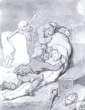 Resurrection Men, by Thomas Rowlandson. Watched by a skeleton, two body snatchers place an exhumed corpse into a sack.