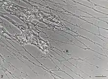 Reticulomyxa has a plasmodial morphology, including a central body surrounded by filose pseudopodia, which have a diameter of approximately 50 μm.[2][5] This organism lacks a test that is a defining characteristic of foraminiferans. This test is suspected to have been lost throughout its evolution due to the adaptation to freshwater environments.[8] When in the vegetative stage, the central body of Reticulomyxa is round and has many pseudopodia extending outwards forming an array or network-like plasmodia which facilitate locomotion and feeding. These pseudopodia consistently change shape and length due to changing environmental and nutrient conditions. In aquatic conditions the pseudopodia branch out in all directions whereas when in moist condition the pseudopodia contract into the central body.[2] The cytoplasm of this organism is thick and streams bidirectionally through the veins.[2][3] Cytoplasmic streaming allowing for the movement of organelles and vacuoles throughout the network can reach speeds of 25 μm/s.[9] Organelle movement is facilitated through the cytoskeleton, which consists of actin and microtubules. Organelles are attached to the microtubules of the cytoskeleton and movement is due to the sliding of microtubules along each other in both directions.[10] This giant freshwater foraminferan contains many haploid nuclei, approximately 5 μm in diameter.[6]