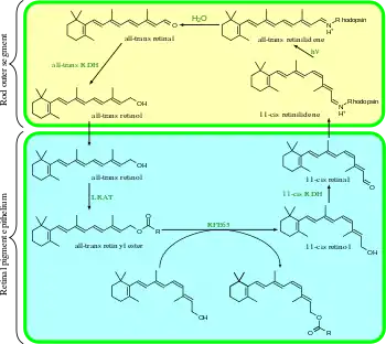 - all-trans-retinyl ester + H2O → 11-cis-retinol + fatty acid; RPE65 isomerohydrolases;[30]
