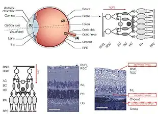 Subretinal implants sit on the outer surface of the retina, between the photoreceptor layer and the retinal pigment epithelium, directly stimulating retinal cells and relying on the normal processing of the inner and middle retinal layers.[3] Adhering a subretinal implant in place is relatively simple, as the implant is mechanically constrained by the minimal distance between the outer retina and the retinal pigment epithelium. A subretinal implant consists of a silicon wafer containing light sensitive microphotodiodes, which generate signals directly from the incoming light. Incident light passing through the retina generates currents within the microphotodiodes, which directly inject the resultant current into the underlying retinal cells via arrays of microelectrodes. The pattern of microphotodiodes activated by incident light therefore stimulates a pattern of bipolar, horizontal, amacrine, and ganglion cells, leading to a visual perception representative of the original incident image. In principle, subretinal implants do not require any external hardware beyond the implanted microphotodiodes array. However, some subretinal implants require power from external circuitry to enhance the image signal.[4]