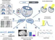 In neuroanatomy, the retinohypothalamic tract (RHT) is a photic neural input pathway involved in the circadian rhythms of mammals.[1] The origin of the retinohypothalamic tract is the intrinsically photosensitive retinal ganglion cells (ipRGC), which contain the photopigment melanopsin. The axons of the ipRGCs belonging to the retinohypothalamic tract project directly, monosynaptically, to the suprachiasmatic nuclei (SCN) via the optic nerve and the optic chiasm.[lower-alpha 1][2] The suprachiasmatic nuclei receive and interpret information on environmental light, dark and day length, important in the entrainment of the "body clock". They can coordinate peripheral "clocks" and direct the pineal gland to secrete the hormone melatonin.