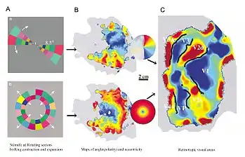 Retinotopy mapping in humans is done with functional Magnetic Resonance Imaging (fMRI). The subject inside the fMRI machine focuses on a point. Then the retina is stimulated with a circular image or angled lines about focus point.[23][24][25] The radial map displays the distance from the center of vision. The angular map shows angular location using rays angled about the center of vision. Combining the radial and angular maps, you can see the separate regions of the visual cortex and the smaller maps in each region.